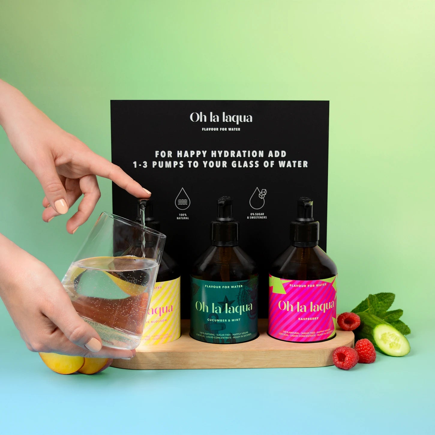 Mit unserer handlichen Probierpackung tauchst du ein in die zuckerfreie Getränkewelt von OH LA LAQUA: Von Bitter Lemon und Gurke & Minze über Pfirsich & Orangenblüte und Grapefruit & Rosmarin bis hin zu Himbeere und Waldmeister.Einfach mehr Wasser trinken
